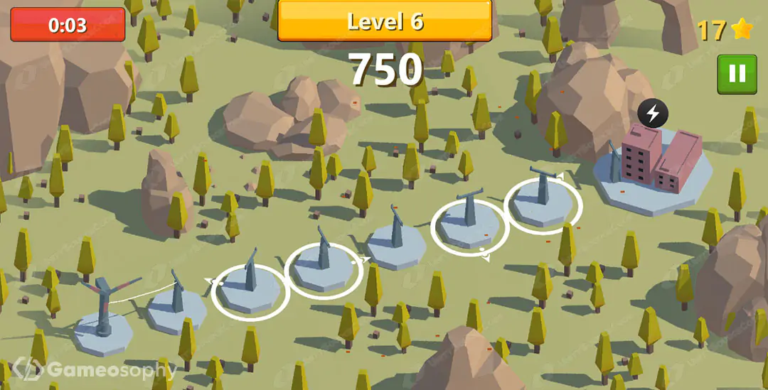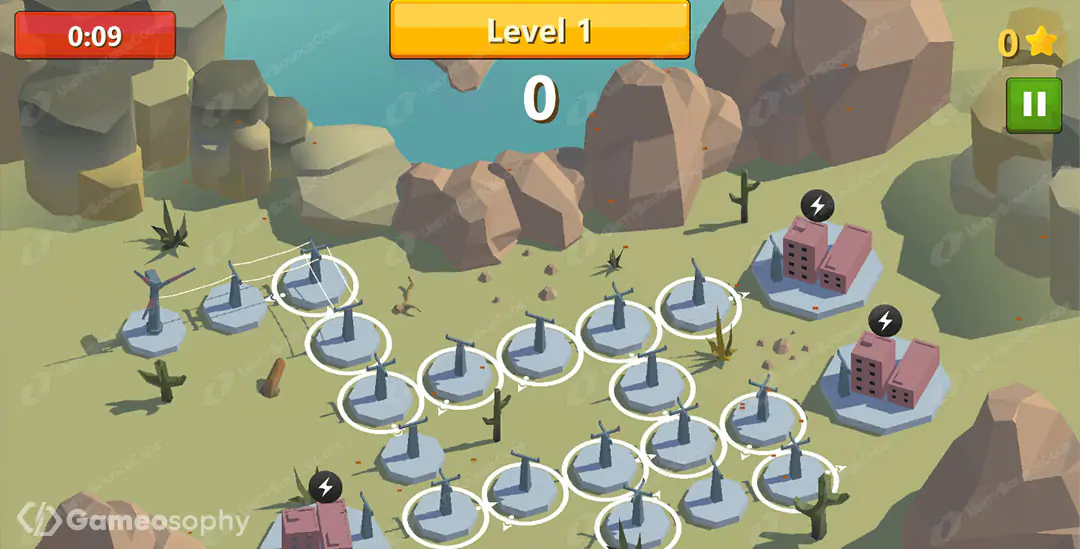 Gameplay Progression: As you advance through levels, the complexity increases, introducing clusters of power lines. Tapping one rotates multiple lines.