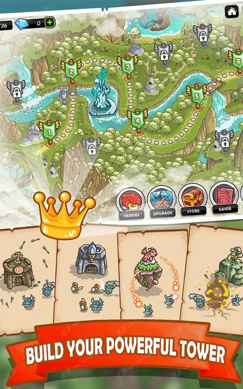 CHALLENGING MODES: Engage in numerous modes within this kingdom defense game. Conquer over 20 levels in Campaign mode, choose from three heroes, and tackle varying difficulty levels: Easy, Normal, and Hard. Daily Trials and Tournament modes offer even more challenges and lucrative rewards.