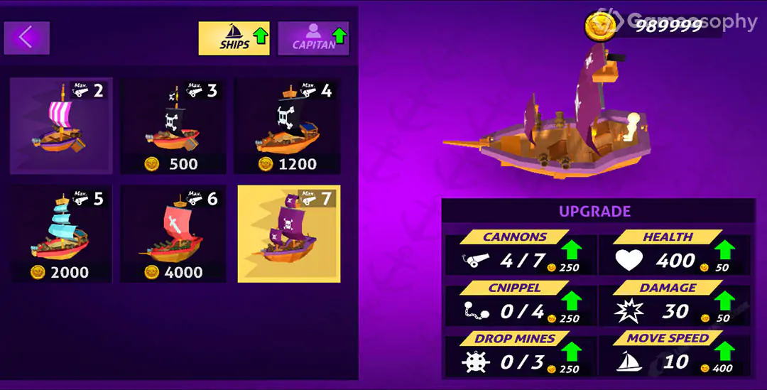Command Your Fleet: Purchase and upgrade a diverse range of ships, each boasting unique strengths to enhance your naval dominance.