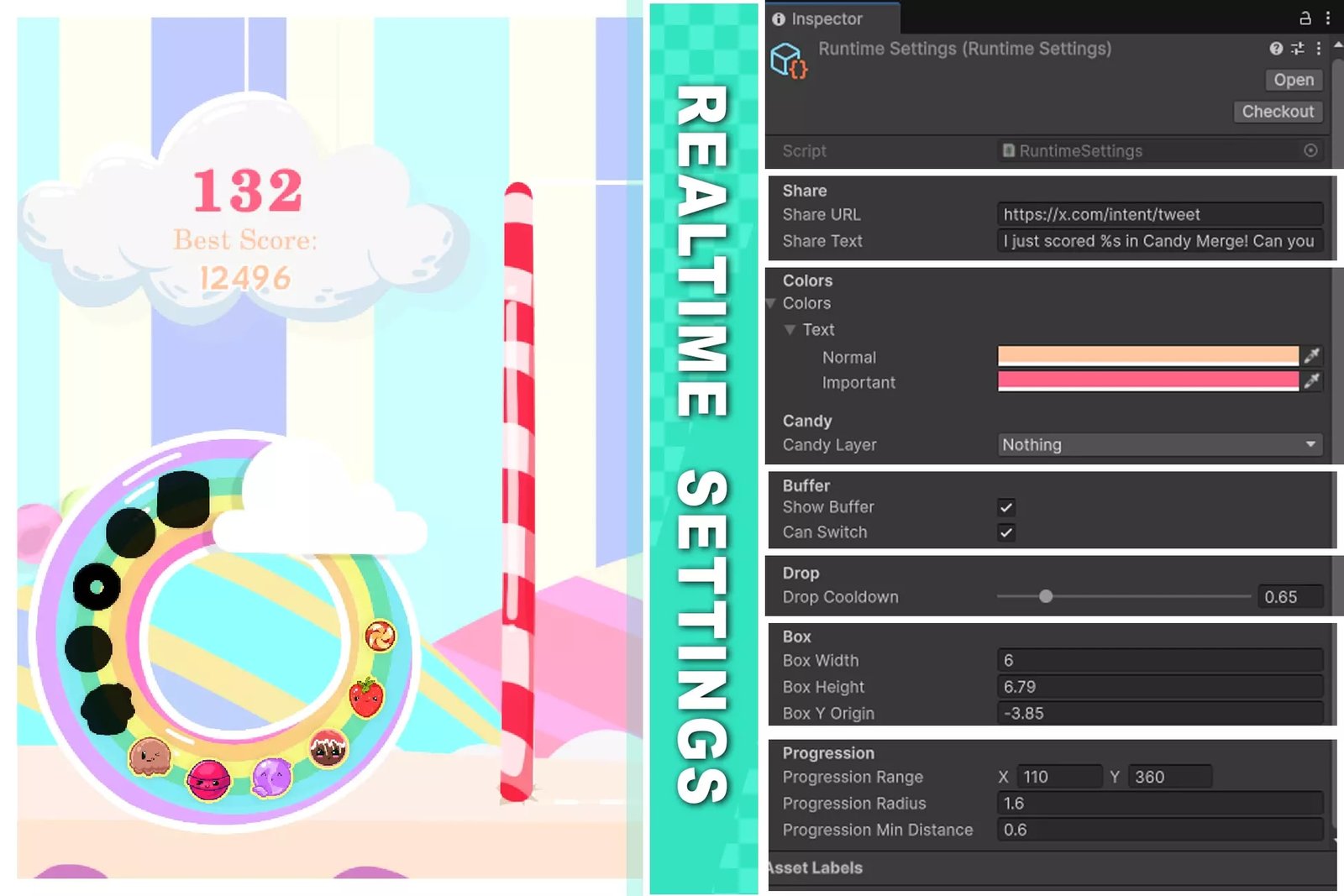 • Customizable Assets: Candies, box dimensions, colors, progression circle, and buffer/switch candy.