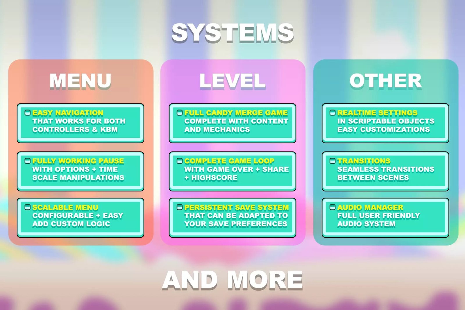 Customizable Game Elements: Easily modify candies, settings, and other game elements to suit your vision. Well-Organized Structure: Divided into systems for simplicity and ease of use.