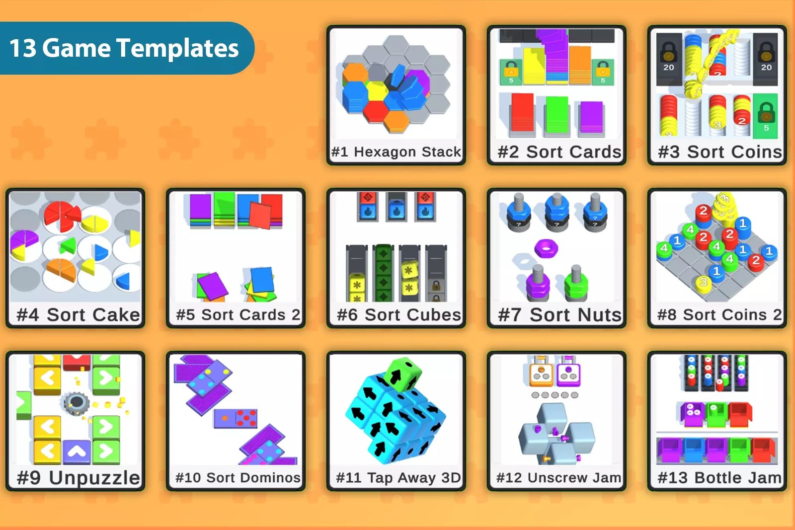 Ready-to-Deploy Templates: Use pre-built templates featuring popular color-sorting and jam puzzle gameplay mechanics designed for Unity.
